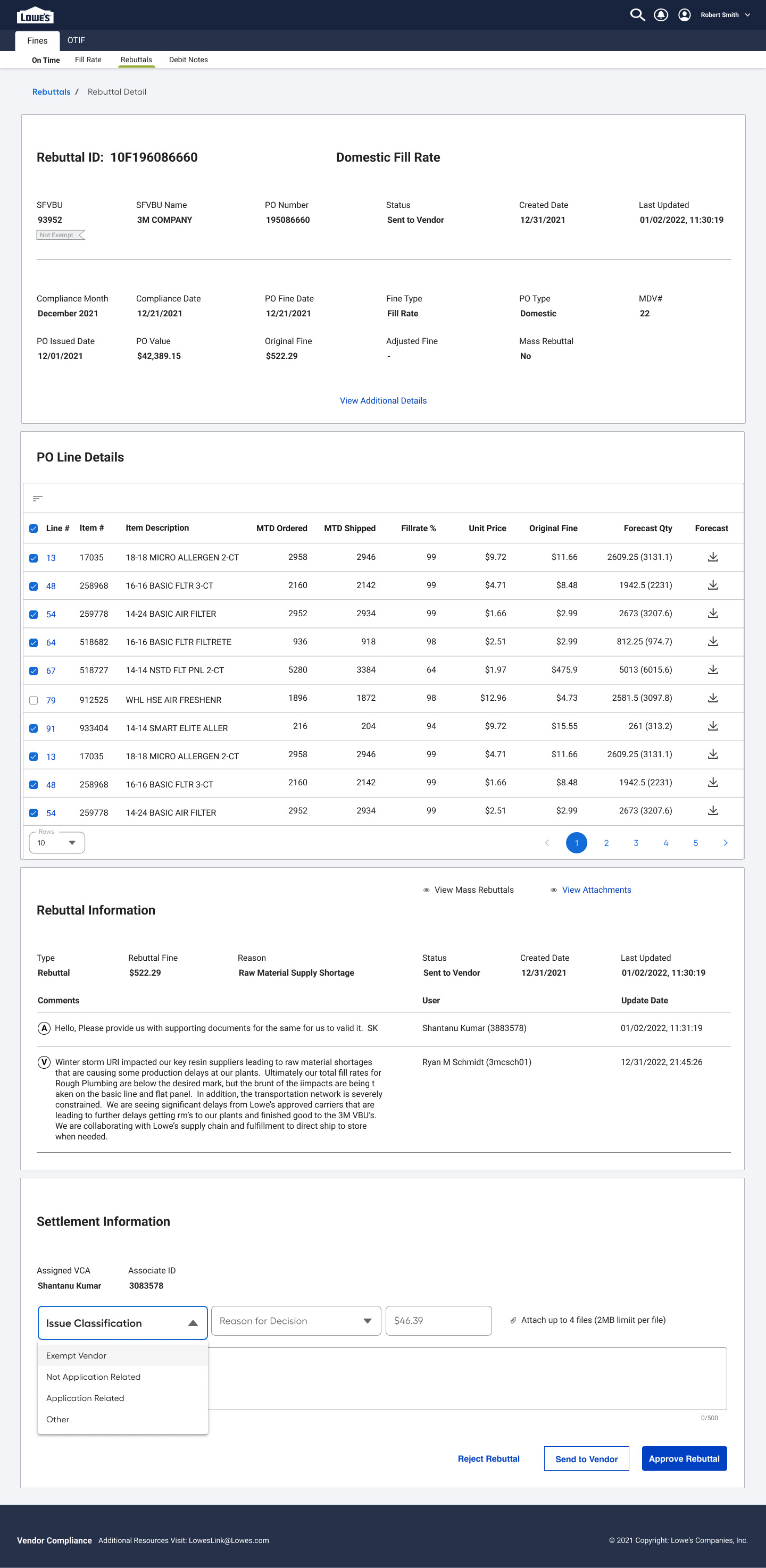 Rebuttal Form Allows vendors to submit a written response, upload evidence, and select a rebuttal category (e.g., Documentation Error, Misunderstanding, Already Resolved).